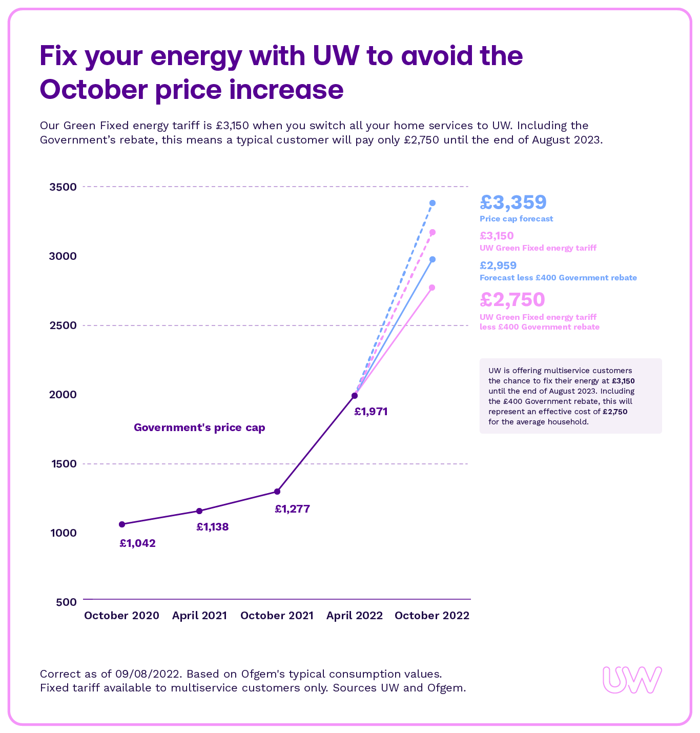 New and existing UW customers, who take two or three other services, will be able to fix their energy at a cost of £3,150 a year for the average customer - until 31st August 2023.